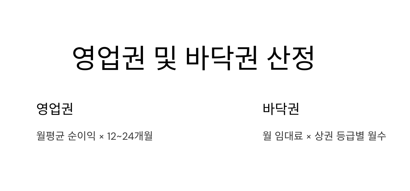 영업권은 월평균 순이익에 업종과 상권의 특성을 고려한 특정 기간(12~24개월)을 곱하여 산정합니다.