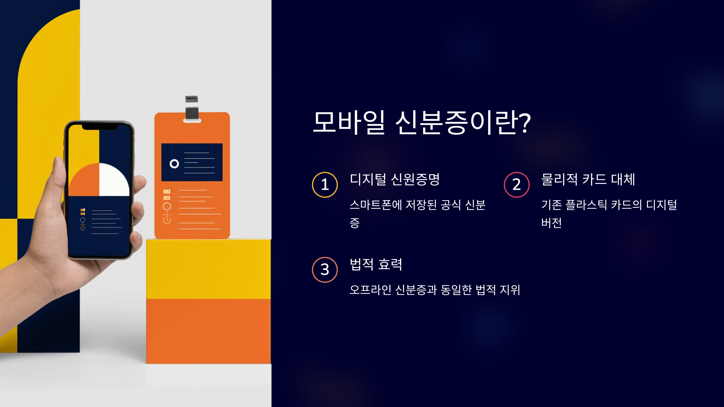 모바일 신분증은 스마트폰에 저장된 디지털 형태의 신분증으로, 신분 확인을 위한 공식적인 인증 수단이에요. 기존의 주민등록증, 운전면허증, 여권 등을 모바일 버전으로 변환한 것이죠.